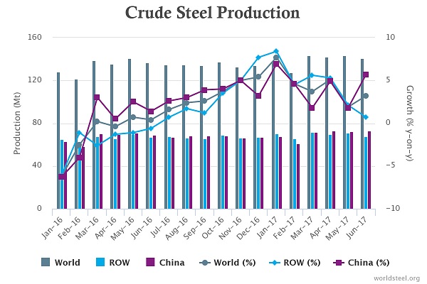 China remained the world’s largest producer in H1 2017 with 419.74 million tons of steel output. It was followed by Japan with 52.30 million tons, India with 49.48 million tons, the United States with 40.59 million tons, Russia with 35.34 million tons, South Korea with 34.69 million tons, Germany with 22.22 million tons, Turkey with 18.21 million tons, Brazil with 16.72 million tons, Italy with 12.35 million tons, Taiwan with 11.59 million tons and Ukraine with 10.50 million tons.